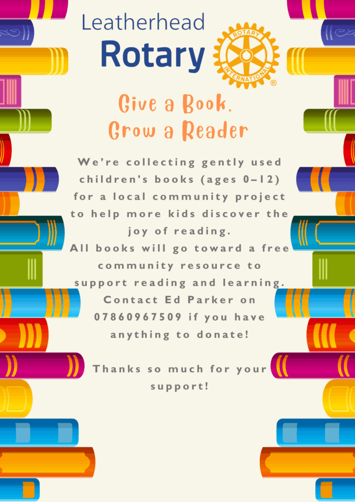Rotary Club of Leatherhead is looking for gently used children’s books (ages 0–12) for a community project aimed at getting more books into the hands of local kids. If you have any kids’ books lying around that your children have
