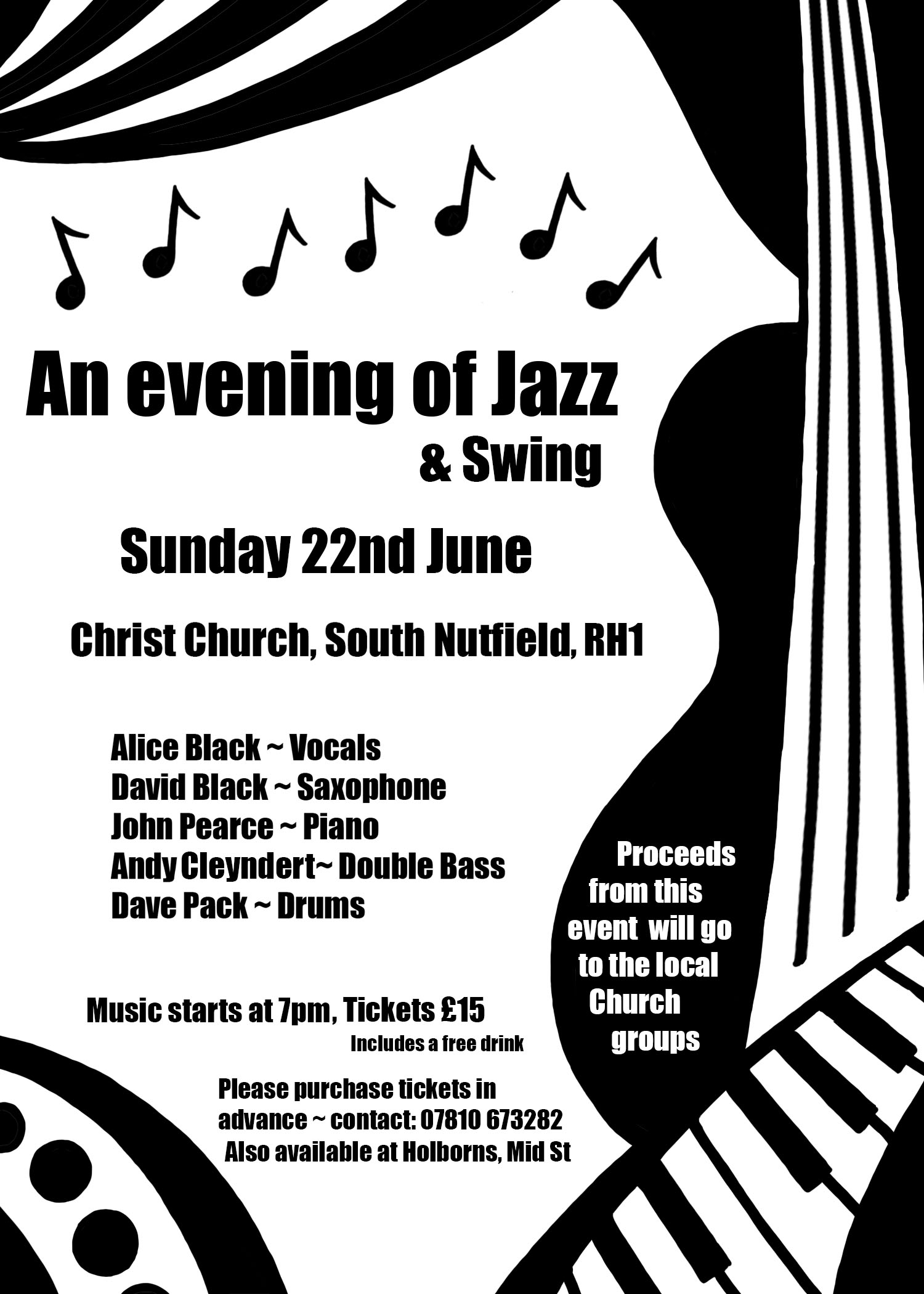 On 22nd June, local singer Alice Black and saxophonist David Black are putting on a jazz and swing concert in South Nutfield. They will be joined by the amazing John Pearce on piano, Andy Cleyndert on double-bass and Dave Pack on drums.